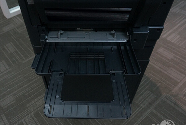除了標(biāo)配一個250頁的進(jìn)紙盒之外,在機(jī)身的側(cè)面,上文提到了許多機(jī)關(guān),其中一個便可以打開多功能手送托盤,柯尼卡美能達(dá)306的多功能手送托盤支持紙張最大的容量為100張,支持的紙張尺寸為A3到A5。