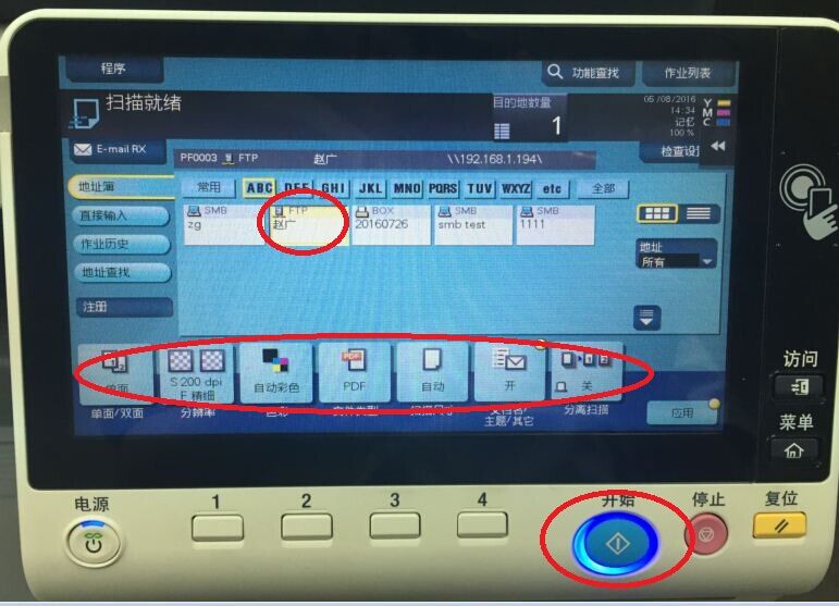 5)選中之前所創(chuàng)建的FTP項(xiàng),設(shè)置好掃描需求后點(diǎn)擊右下方發(fā)光的藍(lán)色開始鍵,回到電腦設(shè)置的文件夾中查找對于圖像即可